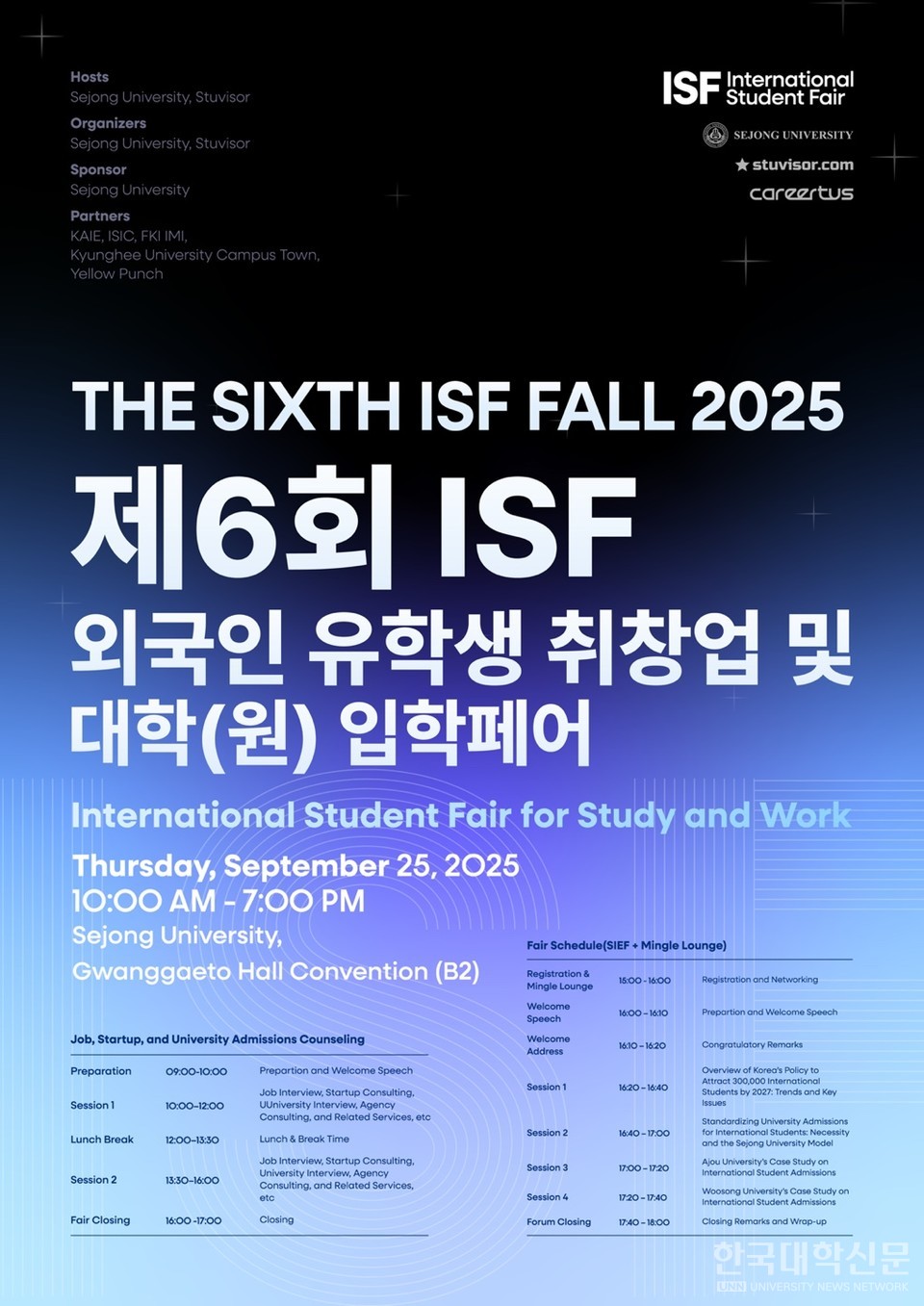 [한국대학신문 이정환 기자] 세종대학교(총장 엄종화)는 글로벌 유학생 플랫폼 스튜바이저(Stuvisor), 외국인유학생 취·창업 전문 플랫폼 커리어투스(Careertus)와 공동으로 오는 25일(목) 오전 10시부터 오후 6시까지 세종대 광개토관 컨벤션홀(B2)에서 ‘제6회 외국인유학생 취·창업 및 대학(원) 입학정보 페어(ISF 2025 Fall)’를 개최한다.