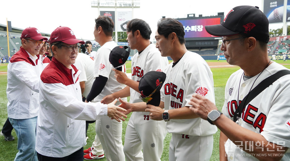 양교 응원단장이 응원 율동을 펼쳐 보이고 있다.(네 번째) 김동원 총장과 김재호 이사장이 야구 선수단을 격려하고 있다.(다섯 번째)