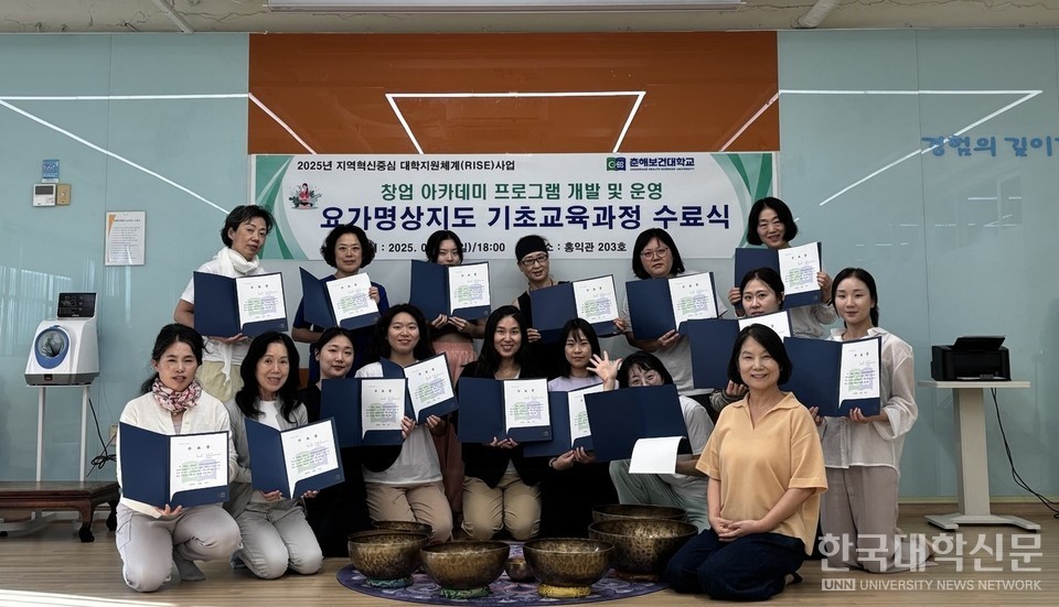 [한국대학신문 정수정 기자] 춘해보건대학교(총장 김희진) RISE사업단은 지난 21일 홍익관 203호에서 ‘요가명상지도 기초교육과정’ 수료식을 열었다. 이번 프로그램은 현대인의 스트레스 완화와 자기관리 역량 강화를 지원하고, 지역에서 활동할 요가명상지도 전문가를 양성하기 위해 마련됐다.