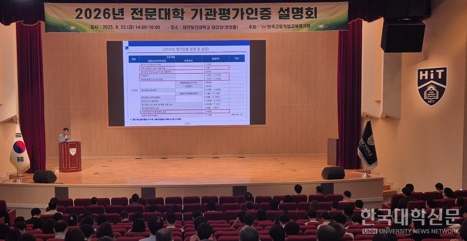 [한국대학신문 정수정 기자] 한국고등직업교육평가원(원장 최준영, 이하 평가원)은 지난달 22일 대전보건대학교(총장 이정화) 청양홀에서 전국 전문대학 기관평가인증 담당자와 교육부 관계자가 참석한 가운데 ‘2026년 전문대학 기관평가인증 설명회’를 개최했다.