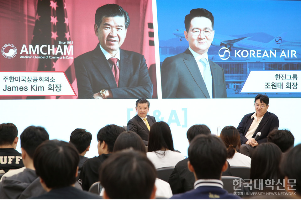 [한국대학신문 김경태 기자] 한국항공대학교가 22일 교내 비전홀에서 제임스 김 주한미국상공회의소(AMCHAM Korea, 암참) 회장 겸 대표이사를 초청해 특별 강연을 개최했다. 이번 행사에는 조원태 한진그룹 회장도 참석해 강연 후 학생들의 질문에 응답하는 간담회를 함께 진행했다.