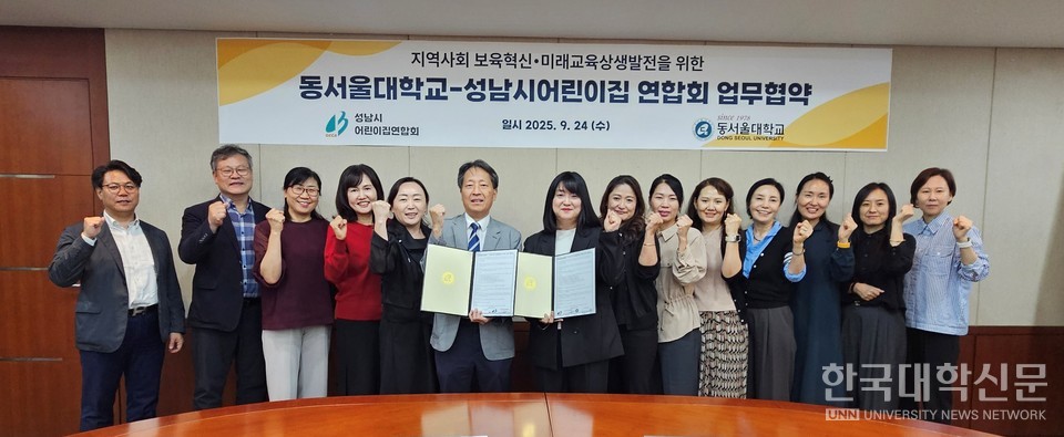 [한국대학신문 이정환 기자] 동서울대학교(총장 유광섭)와 성남시어린이집연합회(회장 김경림)가 지난 24일 동서울대 본관에서 지역사회 보육 혁신과 미래교육의 상생 발전을 위한 업무협약(MOU)을 체결했다. 이번 협약은 대학과 어린이집 간 협력 거버넌스를 새롭게 구축해 보육 교직원의 전문성을 높이고, AI·디지털 전환(DX) 등 미래 핵심 역량 강화를 통해 지역사회 발전에 기여하는 것을 목표로 하고 있다.
