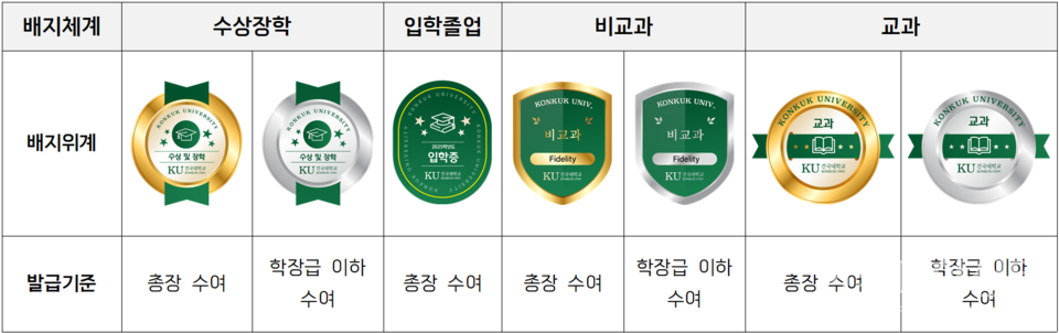 배지는 성과에 따라 금·은 등급을 부여하며, △수상·장학 △입학·졸업 △비교과 △교과 등 분야에서 총 13종이 발급되고 있다. 대표적으로 △신입생에게 발급되는 ‘입학증’ △학점 우수자 대상 ‘Dean’s List’ △학점 만점자에게 수여되는 ‘President’s List’ △장관상 이상 대외 수상자에게 부여되는 ‘대외영예상’ △논문·특허 분야 프로그램 우수 이수자 대상 ‘Super Rookie’ △건국대 인재상에 해당하는 교과·비교과 프로그램을 모두 이수한 자에게 부여되는 ‘WE人학생역량인증장학’ 배지 등이 있다.