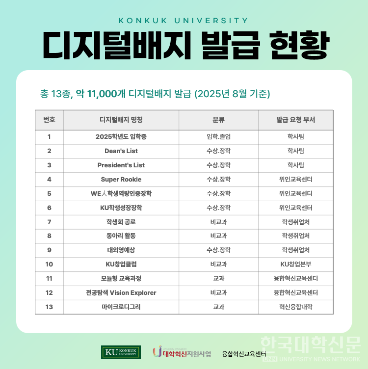 [한국대학신문 문화춘 기자] 건국대학교(총장 원종필)가 올해 3월 국내 대학 최초로 디지털배지 전용 플랫폼(https://badge.konkuk.ac.kr)을 구축해 운영을 시작한 이후, 8월 기준 13종 총 1만1천여 개의 배지를 발급했다고 밝혔다. 불과 반년 남짓한 기간에 이뤄낸 성과로 건국대 학생들의 학업·비교과 내역을 온라인에서 공식 인증하는 제도가 본격 궤도에 오른 셈이다.