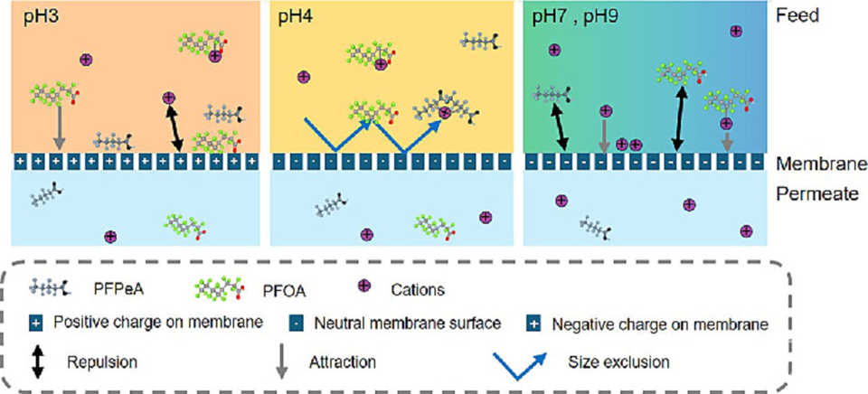 연구 결과, 수소이온농도(pH)가 높아져 물의 성질이 알칼리 쪽으로 갈수록 필터가 더 안정적으로 작동해 과불화화합물의 제거 효율이 향상됐으며, 물속에 함께 섞여 있는 다른 무기이온 성분(칼슘, 나트륨, 마그네슘 등)도 과불화화합물간 전기적 상호작용을 매개해 제거 성능에 큰 영향을 미치는 것으로 나타났다. 특히 분자가 짧은 PFPeA는 잘 걸러지지 않았지만, 분자가 긴 PFOA는 필터 막 표면과의 흡착 친화성이 높아 빠르게 안정화되는 특성을 보였다. 이러한 결과는 필터 표면의 전하와 물속 이온들이 서로 영향을 주고받으며 균형을 이루는 현상인 ‘Donnan 평형’ 여부가 나노여과막 투과 공정에서의 과불화화합물 제거 정도 차이를 만든다는 사실을 입증한 것이다.