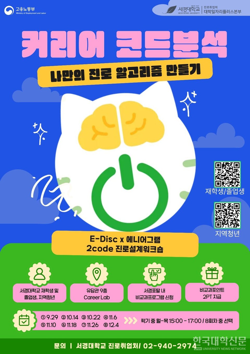 [한국대학신문 이정환 기자] 서경대학교 진로취업처 대학일자리플러스본부는 지난달 29일 유담관 9층 Career Lab에서 서경대 학생 및 지역청년을 대상으로 ‘나만의 진로 알고리즘 - E-Disc × 에니어그램 검사와 함께하는 2code 진로설계 워크숍’ 1회차 프로그램을 성공적으로 마무리했다.