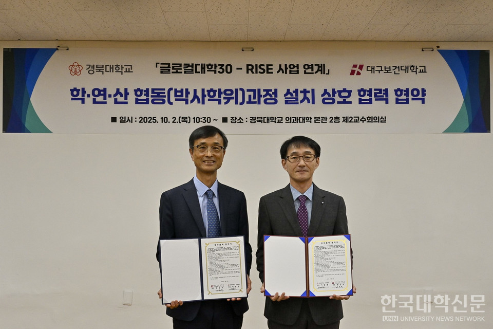 [한국대학신문 이정환 기자] 대구보건대학교(총장 남성희)가 경북대학교(총장 허영우)와 손잡고 전문대학 최초로 국립대학교 연계 박사학위 과정을 개설한다. 양교는 2일 경북대 의과대학 제2교수회의실에서 ‘학·연·산 협동 박사학위 과정 설치를 위한 업무 협약’을 체결하고, 보건의료 분야 최고 수준의 전문가 양성에 협력하기로 했다.