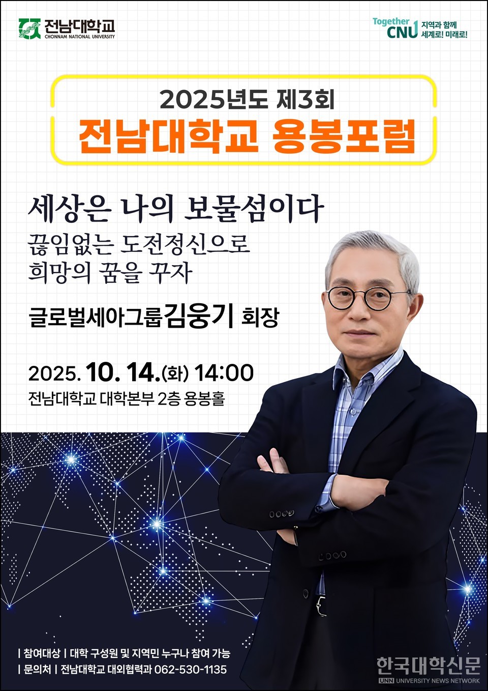 9일 전남대학교(총장 이근배)에 따르면, 오는 14일(화) 오후 2시 국제회의동 2층 용봉홀에서 열리는 ‘2025 제3회 전남대학교 용봉포럼’에서 김웅기 글로벌세아그룹 회장이 ‘세상은 나의 보물섬이다 – 끊임없는 도전정신으로 희망의 꿈을 꾸자’를 주제로 자신의 성공 철학과 글로벌 경영 이야기를 들려줄 예정이다.