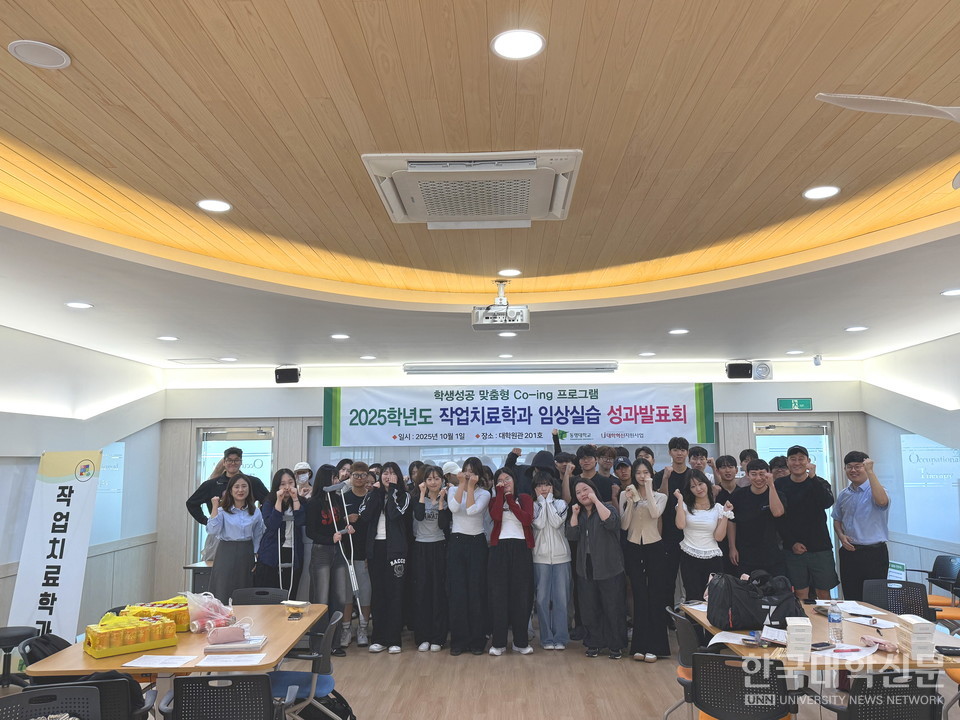 [한국대학신문 김윤미 기자] 동명대학교 작업치료학과(학과장 조승현)는 지난 1일 교내에서 재학생 45명이 참여한 가운데 ‘2025학년도 임상실습 운영 성과발표회’를 개최했다. 이번 발표회는 3학년 학생들의 임상실습 경험을 선후배가 공유하며 실무 중심 학습문화를 조성하기 위해 마련됐다.