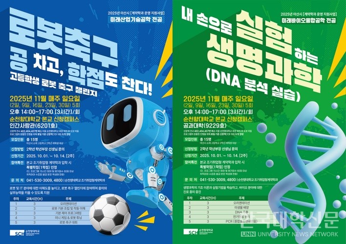 [한국대학신문 김경태 기자] 순천향대학교(총장 송병국)는 아산시 ‘계약학과 운영 지원사업’ 일환으로 오는 11월 매주 일요일 총 5회에 걸쳐 ‘전공 체험 프로그램’을 개최한다고 13일 밝혔다.