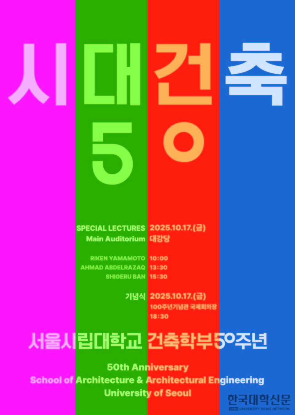 [한국대학신문 박인규 기자] 서울시립대학교(총장 원용걸)는 건축학부 설립 50주년을 맞아 이를 기념하는 다양한 프로그램을 마련했다고 13일 밝혔다.