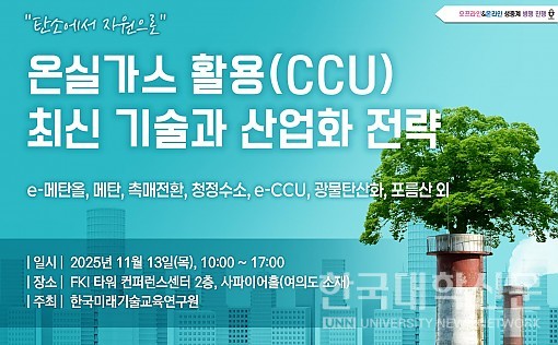 [한국대학신문 이용현 기자] 한국미래기술교육연구원(대표 박희정)은 오는 11월 13일(목) 서울 여의도 FKI타워 컨퍼런스센터 사파이어홀에서 ‘온실가스 활용(CCU) 최신 기술과 산업화 전략’ 세미나를 온·오프라인 병행 방식으로 개최한다고 밝혔다.