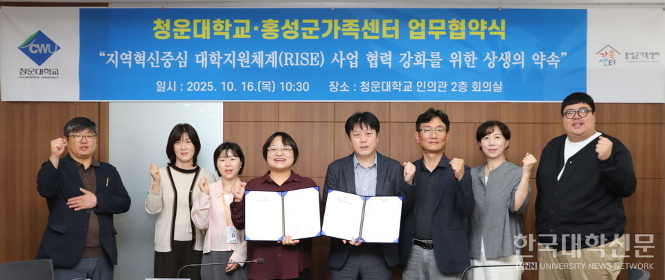 [한국대학신문 박인규 기자] 청운대학교(총장 정윤)는 최근 홍성군가족센터(센터장 김인숙)와 지역혁신중심 대학지원체계(RISE) 사업 협력 강화를 위한 업무협약을 체결했다고 16일 밝혔다.