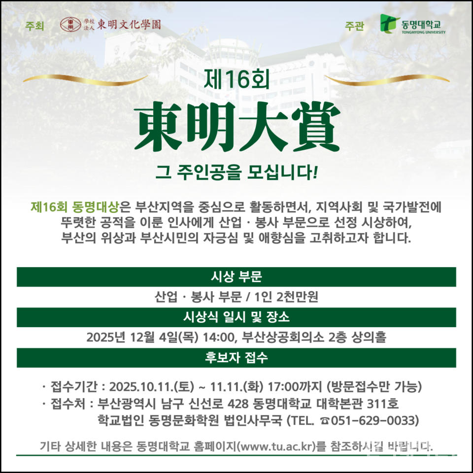 [한국대학신문 문화춘 기자] 학교법인 동명문화학원(이사장 강경수)과 동명대학교(총장 이상천)는 2025년 제16회 동명대상 산업·봉사 부문 후보자 추천을 오는 11월 11일(화요일)까지 접수한다고 밝혔다. 수상자 1인에게는 2000만 원의 상금이 지급된다.
