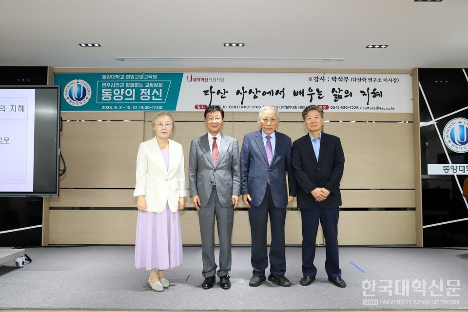 [한국대학신문 박인규 기자] 동양대학교(총장 최성해) 현암교양교육원은 교내 구성원들과 영주 시민들의 역량을 응집할 수 있는 특성화 전략의 일환으로 영주 시민과 함께하는 교과목 ‘동양의 정신’을 개설해 운영하고 있다. ‘동양의 정신’ 교과목은 2학기 학사 일정에 맞춰 진행하고 있는데, 그 핵심은 저명인사의 특강에 초점을 두고 있다.