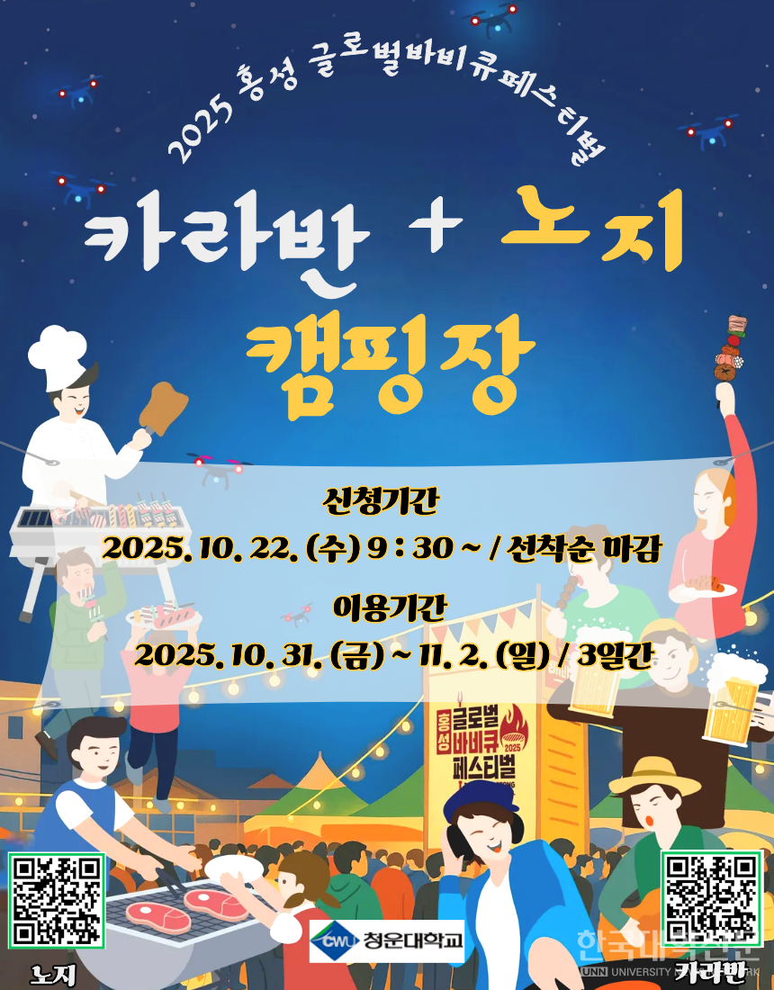 [한국대학신문 김연주 기자] 청운대학교(총장 정윤)는 지역의 대표축제인 ‘2025 홍성글로벌바비큐페스티벌’의 성공과 지역 상생을 위해 오는 31일부터 다음달 2일까지 캠퍼스를 개방해 ‘2025 청운대학교 카라반·오토 캠핑장’을 운영한다고 21일 밝혔다.
