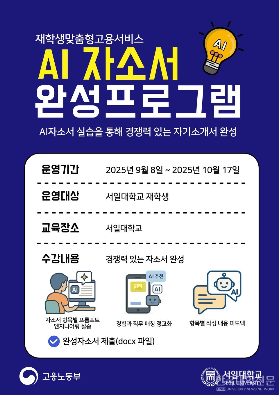 [한국대학신문 심정은 기자] 서일대학교(총장 오선) 재학생맞춤형운영팀은 2025학년도 2학기에 운영한 ‘AI 자소서 완성 프로그램’을 성공적으로 마무리했다고 밝혔다. 2025년도 재학생 맞춤형 고용서비스 프로그램의 일환으로 진행된 이번 프로그램은 급변하는 채용 환경에 맞춰 AI 기술을 활용한 자기소개서 작성 역량을 극대화하는 데 중점을 뒀다.