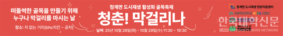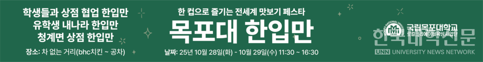 [한국대학신문 이정환 기자] 국립목포대학교(총장 송하철)는 전라남도, 무안군과 협력해 무안군 청계면 대학 후문 상권 일원(골목형 상점가 지정 구역)에서 오는 28일부터 11월 2일까지 지역 상권 활성화 프로젝트인 ‘청계 후문 골목 축제–목포대 다니면서 아직까지 제대로 해본 게 없더라고요’를 개최한다고 밝혔다.
