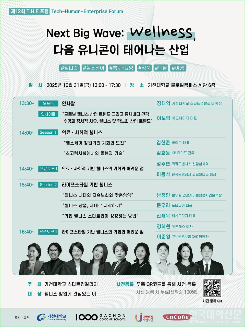 ‘GCS THE Forum’은 가천코코네스쿨이 매 학기 인간(人)·기술(Tech)·기업(Enterprise)의 관점에서 주요 사회 이슈를 다루는 창업·혁신 포럼 시리즈다. 이번 포럼은 웰니스 창업에 관심있는 누구나 사전등록을 통해 무료로 참여가 가능하며, 오프라인과 함께 유튜브 생중계로 동시에 진행된다.