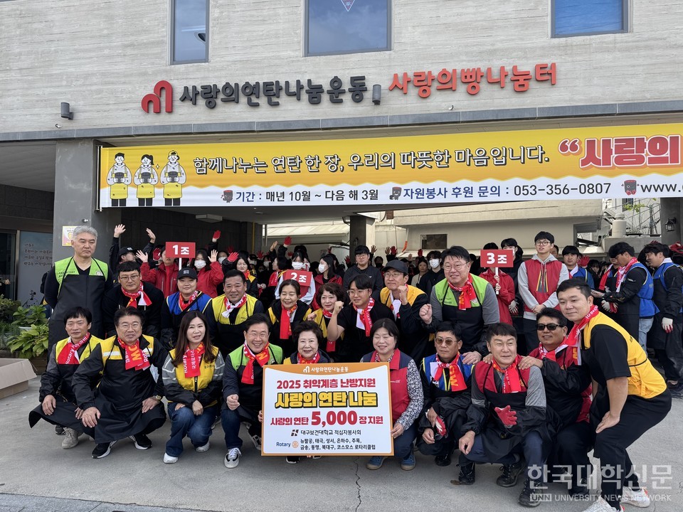 [한국대학신문 김영성 기자] 대구보건대학교(총장 남성희)는 지난 25일 대구보건대 적십자봉사회 교직원, 총학생회와 재학생, 국제로타리 3700지구 대구뉴팔공 로타리클럽과 공동으로 대구시 서구 비산동 일대에서 ‘2025 사랑의 연탄나눔’ 봉사 활동을 전개했다.