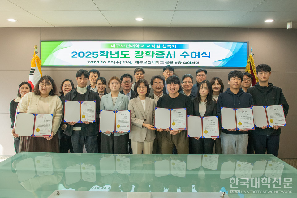 [한국대학신문 김영성 기자] 대구보건대학교(총장 남성희) 교직원친목회는 29일 본관 9층 글로벌대학회의실에서 ‘2025 교직원친목회 사랑의 장학금’ 수여식을 열고 7개 학과 재학생 7명에게 장학금을 전달했다.