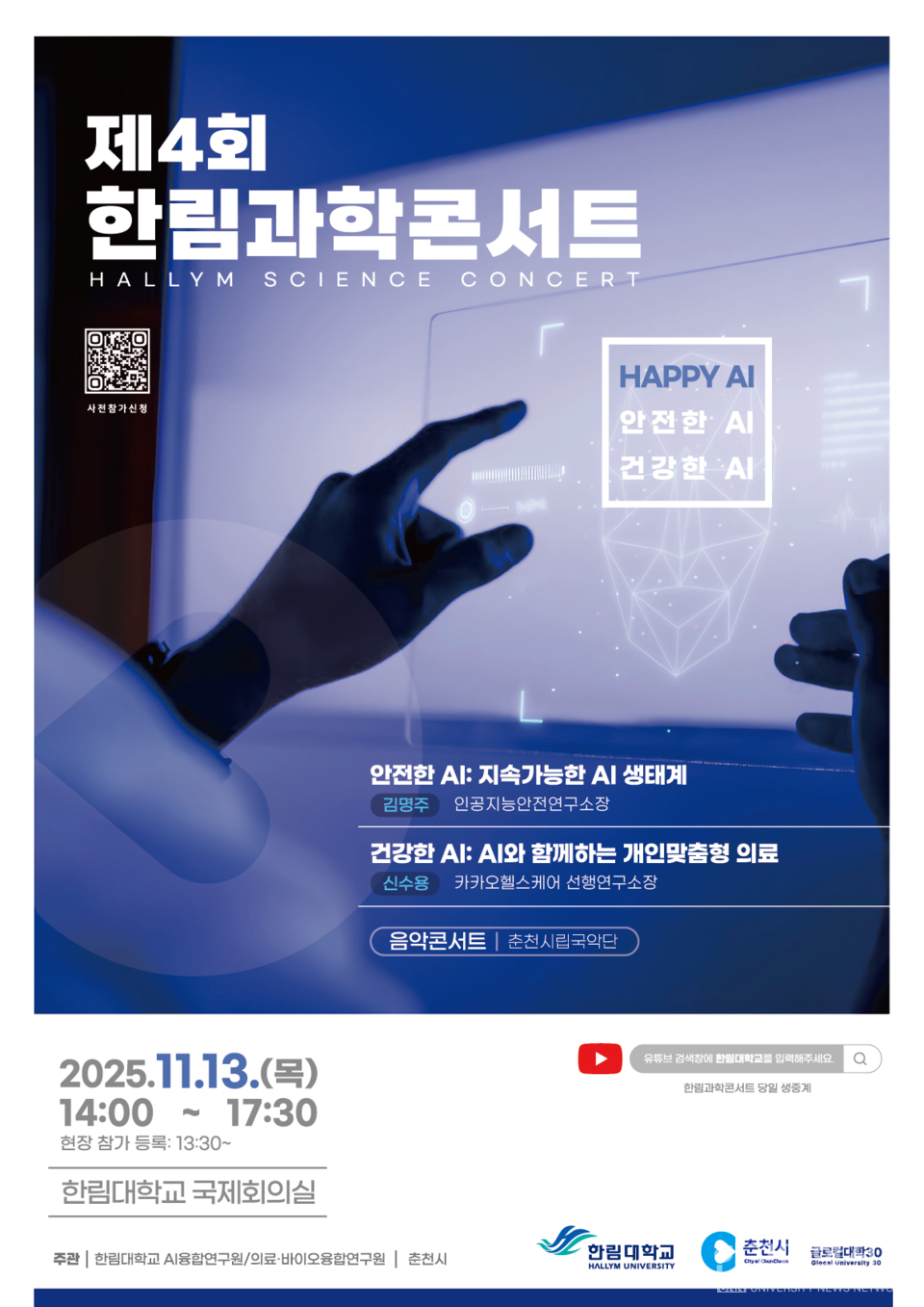 한림대 최양희 총장은 “이번 제4회 한림과학콘서트는 춘천시와 협력하여 AI 기술이 대학의 울타리를 넘어 모든 시민의 삶을 ‘안전’하고 ‘건강’하게 만드는 따뜻한 동반자가 될 수 있음을 확인하는 자리가 될 것”이라며, “한림대학교의 지성이 지역사회와 만나 새로운 가치를 창출하는 교류의 장이 되기를 기대한다”고 밝혔다.