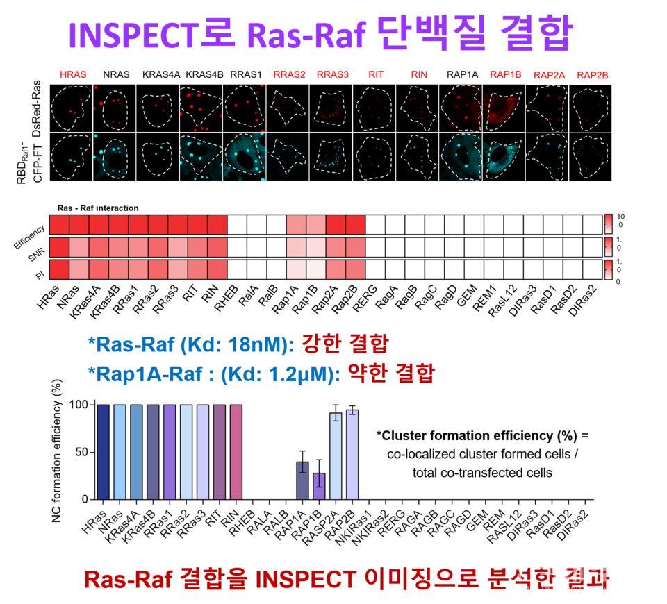 INSPECT 기술은 단백질이 서로 붙을 때 서로 잘 섞이지 않고 구분된 영역이 자연스럽게 생기는‘상분리(phase separation)’현상을 인공적으로 구현하는 기술로, 세포 속에서 단백질들이 실제로 어떻게 결합하는지를 형광 신호로 직접 볼 수 있는 기술이다.