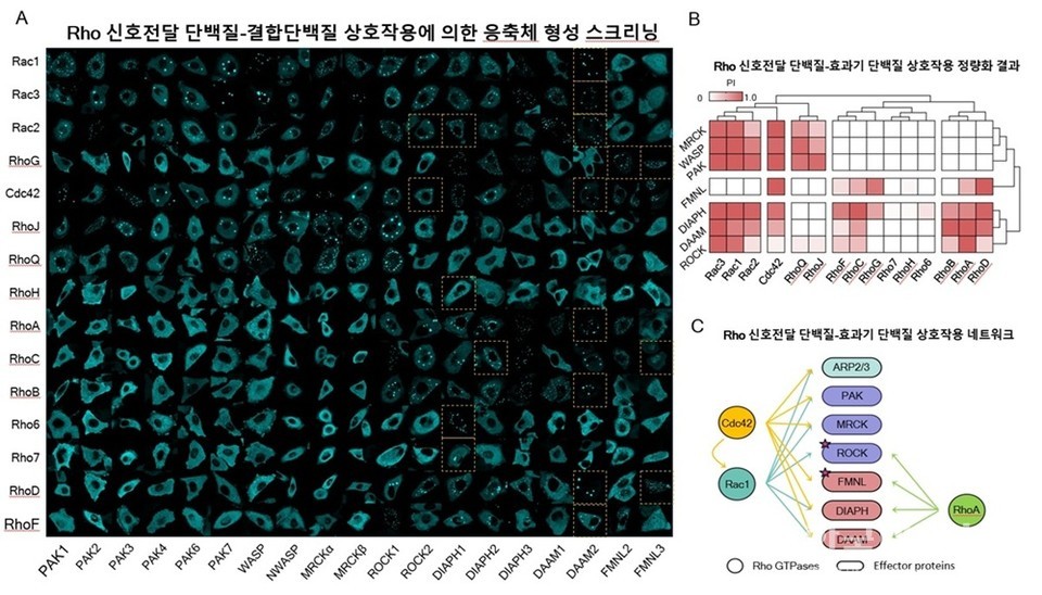 15종의 Rho 단백질과 19종의 결합 후보 단백질 간 총 285쌍의 상호작용을 스크리닝하여 139쌍의 양성 상호작용을 규명했다. 특히 Rac1–ROCK 축과Cdc42–FMNL 축이 세포 이동의‘직진’과‘회전’을 결정하는 핵심 회로임을 밝혀냈다.