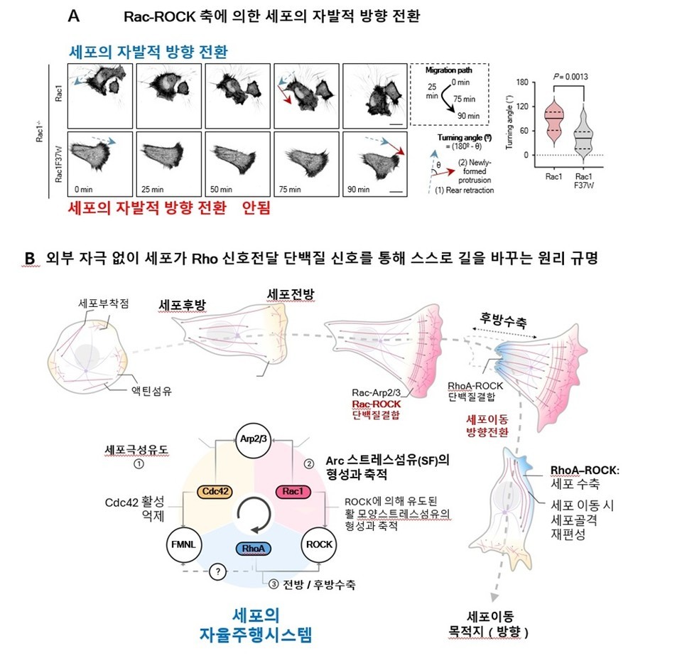 연구팀은 세포 이동을 조절하는 주요 신호전달 단백질인 Rho 신호전달 단백질 중 Rac1과Cdc42가 세포 전방에서 돌출 구조(라멜리포디아·필로포디아)를 형성하고, RhoA가 후방에서 수축을 유도한다는 기존 모델을 넘어서, 각 Rho 단백질이 어떤 결합단백질과 결합하느냐에 따라 세포 이동의 방향성과 회전 동작이 정밀하게 제어된다.
