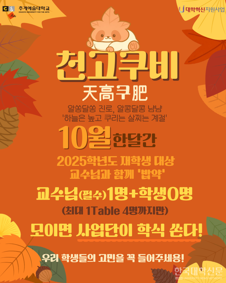 [한국대학신문 김연주 기자] 추계예술대학교(총장 임상혁)는 지난 10월 한 달 동안 재학생들의 학교 생활 적응을 돕기 위한 ‘알쏭달쏭 진로, 알콩달콩 냠냠’ 프로그램을 진행했다고 11일 밝혔다.
