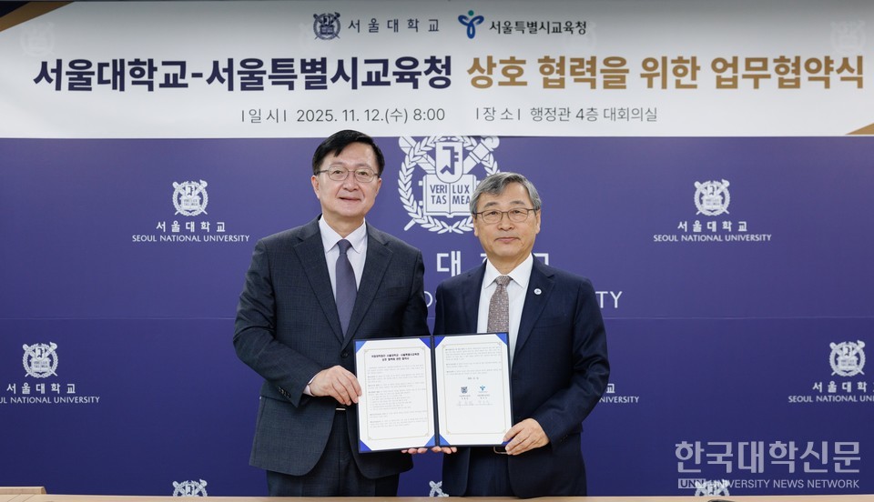 [한국대학신문 이정환 기자] 서울대학교(총장 유홍림)는12일 서울대 행정관(60동)에서 서울특별시교육청(교육감 정근식)과 상호 협력을 위한 업무협약을 체결했다. 양 기관은 이번 협약을 통해 AI 및 데이터 기술을 활용해 교육 발전 및 연구 협력 관계를 구축하고, 보유한 지식과 자원의 공유 및 상호 발전을 위해 노력할 계획이다.