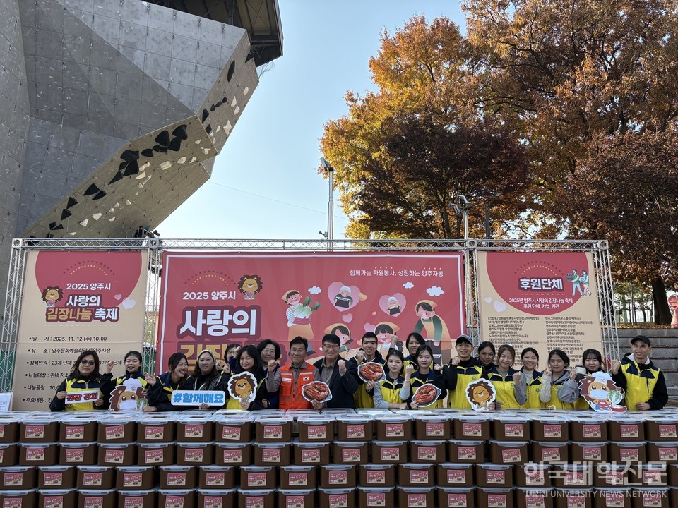 [한국대학신문 심정은 기자] 서정대학교(총장 양영희)는 12일 양주시자원봉사센터가 주관한 ‘2025 사랑의 김장나눔 축제’에 참여해 지역사회와 함께하는 나눔의 장을 마련했다. 이번 행사는 서정대 SJ자원봉사단이 함께하는 ‘서정 온(溫)기나눔 프로젝트’의 두 번째 프로그램으로, 작년에 이어 국제학생과 성인학습자들이 참여해 세대와 국적을 넘어 따뜻한 정(情)을 나눴다.
