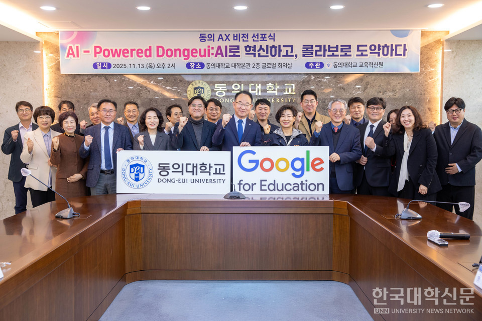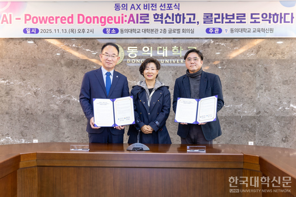 [한국대학신문 이용현 기자] 동의대학교(총장 한수환)는 지난 13일 대학 본관 2층 회의실에서 ‘동의 AX 비전 선포식’을 진행하고, AI 기반의 대학 교육체제 전환과 미래형 콜라보 교육을 공식 선언했다.