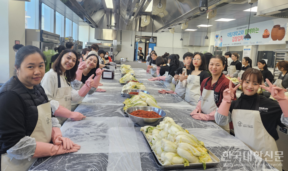 [한국대학신문 이서혜 기자] 대림대학교(총장 권순황)가 2025년 전문대학 혁신지원사업 3주기, K-CULTURE 글로벌 확산 모델, 지역연계 프로그램의 일환으로 지난 14일 안양시 가족센터와 함께 외국인 유학생을 위한 김장김치 체험 및 전달식을 율곡관 7층 호텔조리과 레스토랑홀에서 실시했다.