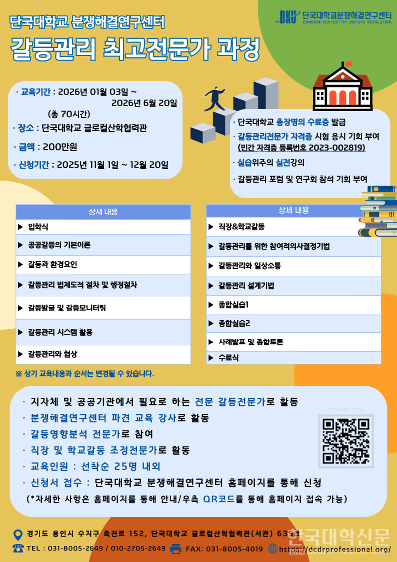[한국대학신문 김윤미 기자] 단국대학교 분쟁해결연구센터(소장 가상준)가 사회·공공갈등 해결을 위한 전문가 양성 과정인 '갈등관리 최고전문가 과정'(민간 자격증반) 5기 교육생을 모집한다.