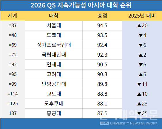 이후 1년 만인 2026 순위에서 서울대는 20계단 상승해 세계 37위로 아시아권 1위를 차지했다. 도쿄대는 작년보다 4계단 내려앉아 아시아권 2위·세계 48위를 기록했다. 이어 싱가포르국립대(69위), 국립대만대(72위), 연세대(92위), 고려대(95위), 난양공과대(99위), 교토대(114위), 도후쿠대(125위), 홍콩대(137위)가 뒤를 이으며 아시아 톱10을 완성했다.