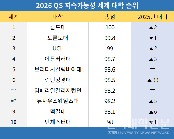 [한국대학신문 윤채빈 기자] 18일 발표된 ‘2026 QS 세계 대학 순위: 지속가능성(QS World University Rankings: Sustainability 2026)’에서 서울대가 2년 만에 도쿄대를 제치고 아시아권 대학 1위에 올랐다. 연세대(92위)와 고려대(95위)는 각각 6계단 하락·상승했지만 모두 아시아권 톱10에 들었다.
