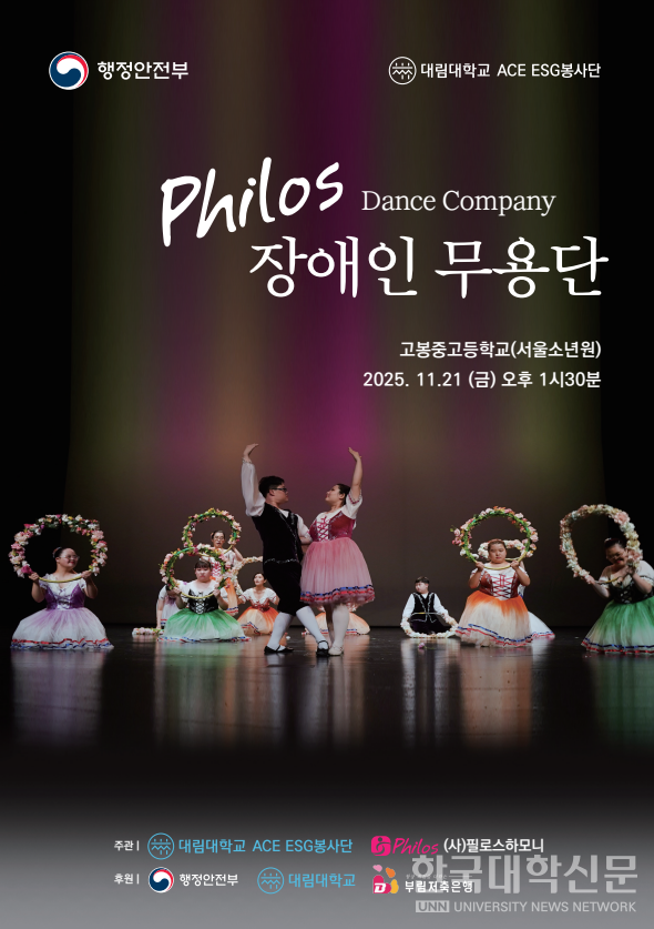 [한국대학신문 심정은 기자] 대림대학교(총장 권순황) ACE ESG봉사단 필로스장애인무용단(단장 임인선, 대림대 스포츠재활학부 교수)이 오는 21일 오후 1시 30분 고봉중고등학교(서울소년원)에서 공연을 한다.