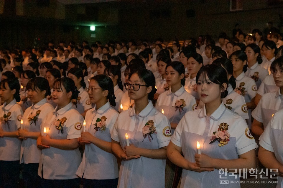 선서식은 우수한 학업과 성품을 인정받아 ‘영 나이팅게일’로 선발된 4학년 이지훈(24·남), 김서현(23·여) 학생이 촛불을 들고 입장하며 시작됐다. 이들은 임상실습을 앞둔 2학년 후배 307명에게 숭고한 간호 정신을 상징하는 촛불을 전하며 행사의 의미를 더했다.