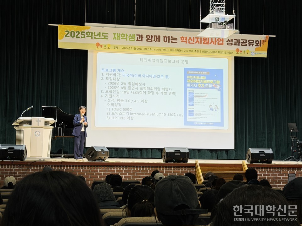 [한국대학신문 심정은 기자] 배화여자대학교(총장 이후천)는 20일 교내 대강당에서 재학생을 대상으로 ‘2025학년도 재학생과 함께하는 혁신지원사업 성과공유회’를 개최했다. 이번 성과공유회는 혁신지원사업을 통해 추진된 교육 혁신 및 교육환경 개선 성과를 재학생과 직접 공유하고, 향후 발전 방향을 논의하기 위해 마련됐다.