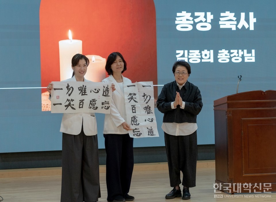 김종희 총장은 모든 것은 마음먹기에 달려 있다는 뜻의 ‘일체유심조(一切唯心造)와 한 번의 미소가 백 가지 근심을 잊게 한다는 뜻의 ‘일소백려망(一笑百慮忘)’을 직접 붓글씨로 써서 선물하며 간호학과 학생들을 응원했다.