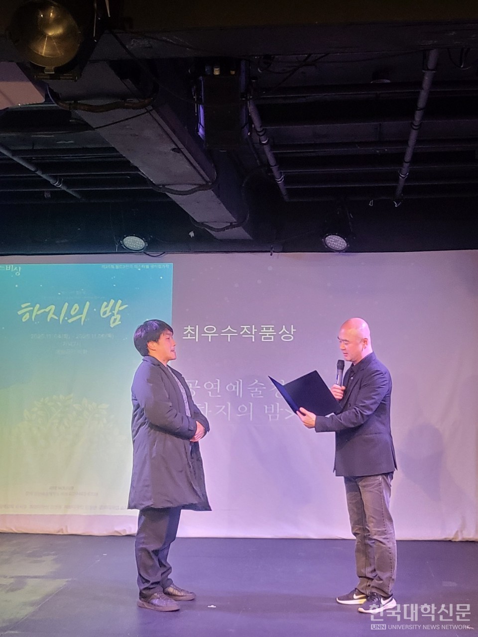 [한국대학신문 심정은 기자] 대경대 연기예술과 김정근 교수가 연출한 ‘하지의 밤’이 지난 23일까지 대학로 일대 소극장에서 개최된 제25회 월드2인극 페스티벌(조직위원장 김진만)에서 최우수작품상과 연기상(고훈목)을 수상했다.