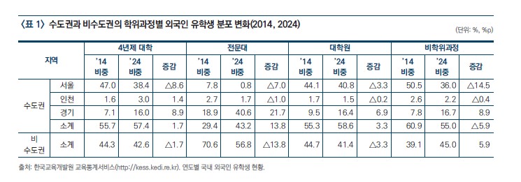 최정윤 KEDI 선임연구원은 “지역에서 외국인 유학생 수가 늘어나도 이들이 해당 대학 및 지역에 머무는 기간이 짧다는 것을 의미해 지역정주 측면에서 부정적인 신호로 해석될 수 있다”며 “최근 입학 문턱이 낮은 비수도권 대학의 어학연수과정을 기착지로 활용한 뒤, 일자리·생활 인프라가 잘 갖춰진 수도권 소재 대학으로 편입하는 사례도 늘고 있다”고 했다.