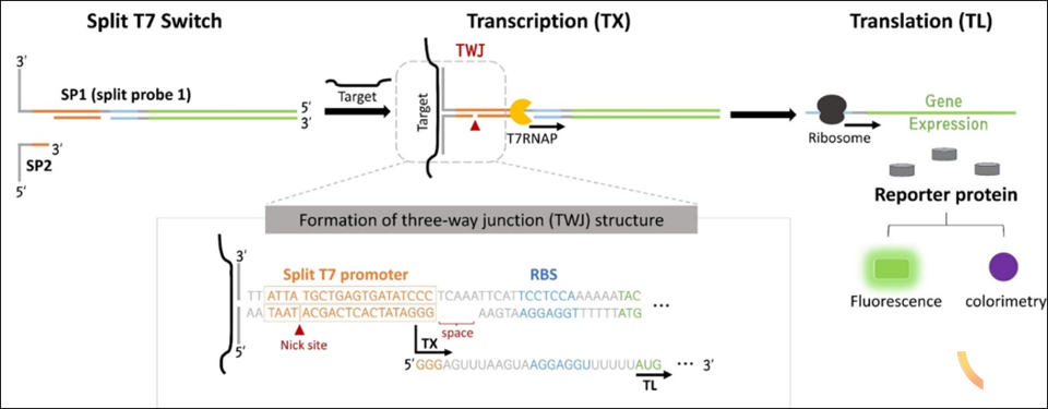 ‘split T7 switch’은 병원체의 DNA, RNA와 같은 표적 핵산을 검출하기 위한 스위치다. 검출하고자 하는 표적 핵산이 존재하면 3방향 접합 구조가 형성되고, 완전한 형태의 분할 T7 프로모터를 생성해 무세포 단백질 합성 시스템(cell-free protein synthesis; CFPS)을 통한 전사(transcription) 및 번역(translation)이 시작된다.